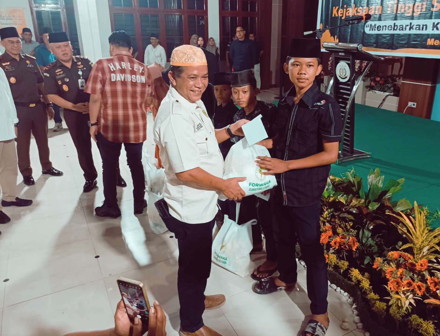 Santunan kepada anak yatim piatu diserahkan secara langsung oleh Kajati Sumut Dr. Harli Siregar. Penyerahan tersebut didampingi oleh Wakajati Sumut Abdullah Noer Deny, Ketua Forwaka Sumut Irfandi, Ketua PWI Sumut Farianda Sinik, Ketua SMSI Sumut Erris J Napitupulu, dan Ketua JMSI Sumut Rianto, S.H.