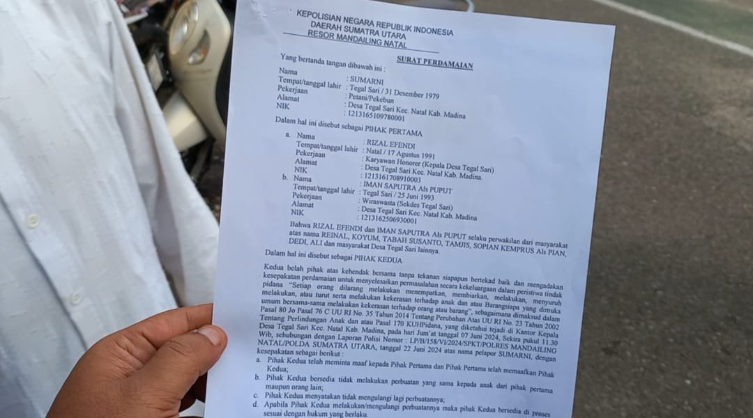 MANDAILING NATAL II DATAPOST.ID – Remaja yang diduga dianiaya warga, Sekretaris Desa (Sekdes) dan Kepala Desa (Kades) di Desa Tegal Sari, Kecamatan Natal, Kabupaten Mandailing Natal (Madina) tempuh jalur perdamaian.
