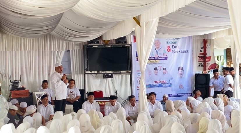 “Onma, “Onma” siapa Bupati kita, Harun – Ichwan, siapa Gubernurnya, Bobby – Surya, nomor 1,” teriak ratusan ibu ibu serentak yang membuat suasana pengajian menjadi semakin meriah sebelum dimulainya pengajian dengan penceramah Ustadz Salman Nasution itu.