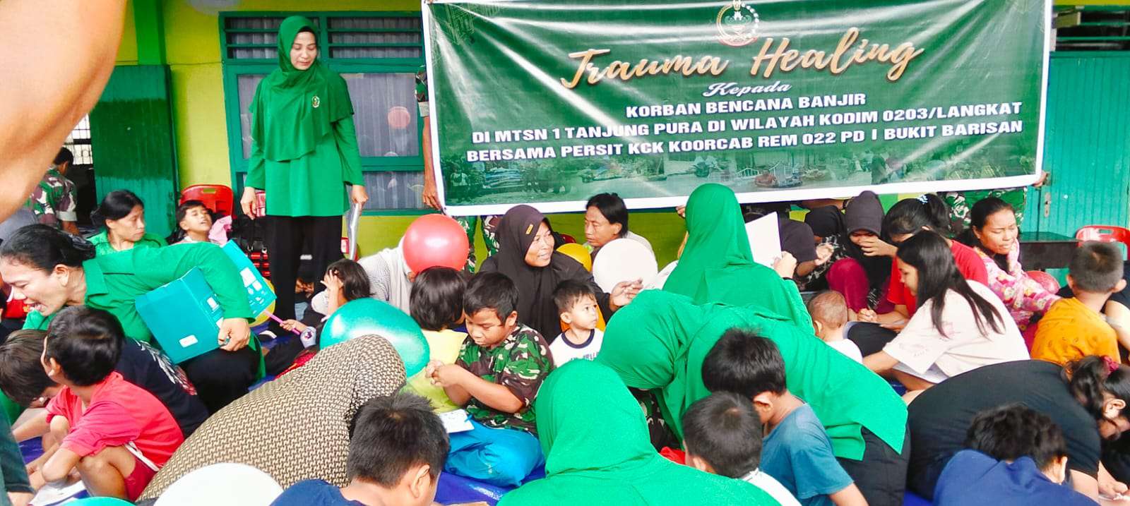Kegiatan trauma healing dilaksanakan oleh Korem 022/Pantai Timur dengan melibatkan personel TNI yang berpengalaman dalam pendampingan korban bencana.